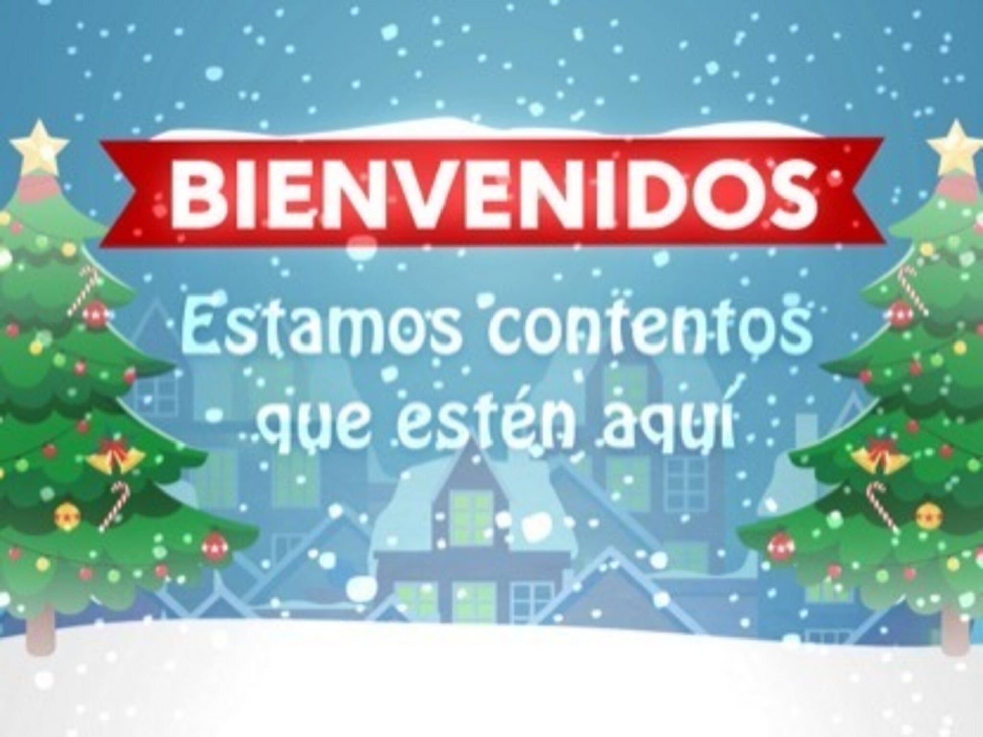 This festive motion features a beautiful village background with tiny falling snowflakes. Two fully decorated Christmas trees stand proudly on either side of the fallen snow. The bright colors help to bring a cheerful spirit to your Christmas service. At the top of this background, a red banner displays with the word “Bienvenidos”. The words “Estamos contentos que estén aqui” are shown below the Bienvenidos banner. This fun background is a great welcome background for the Christmas or winter season#VALUE The Christmas Village Welcome – Spanish Motion Background is part of the Christmas Village Spanish Collection.